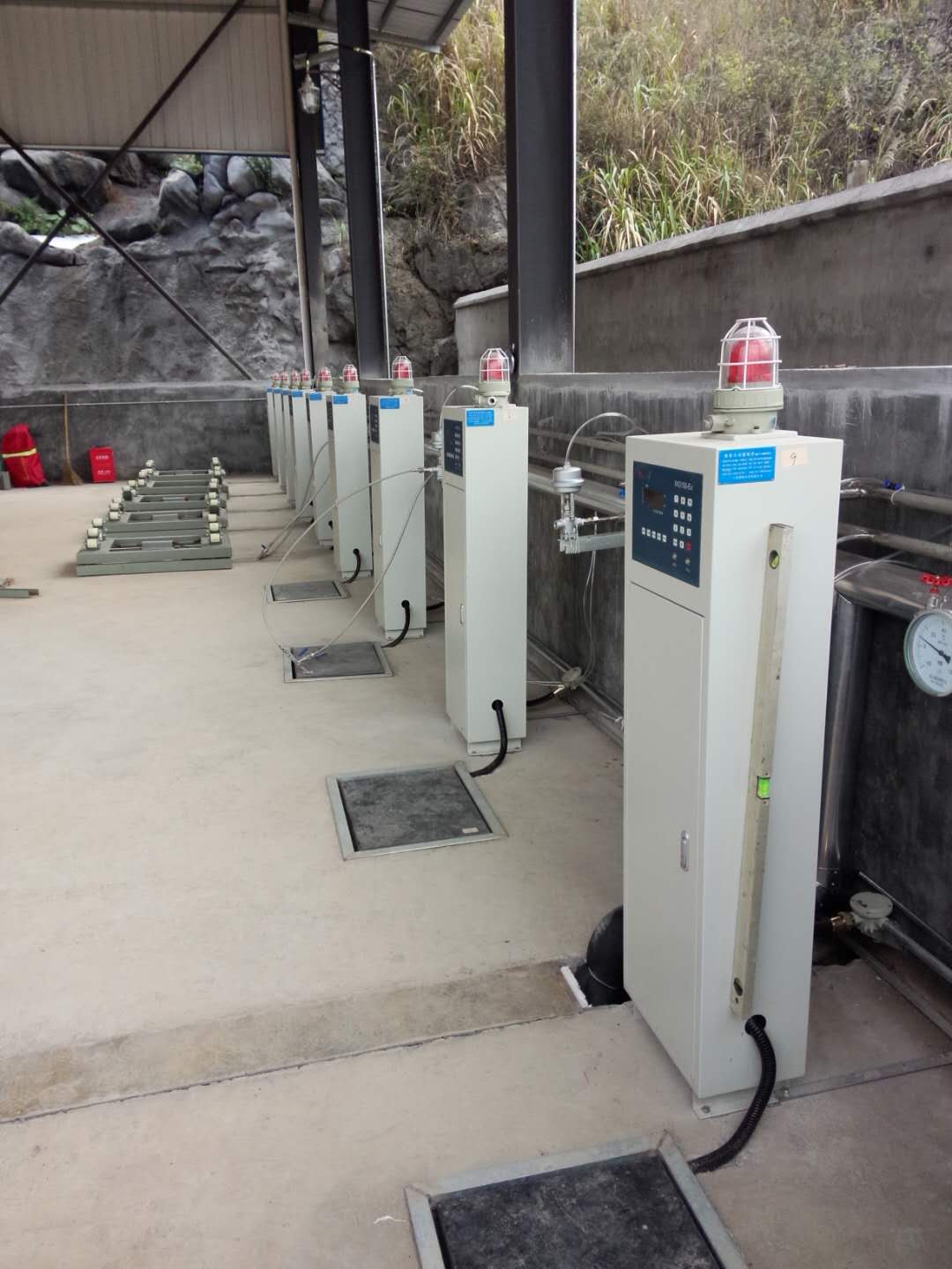 稱重秤台由型材和板材焊接而成,稱重傳(chuán)感器固定在秤(chèng)台中,待灌裝或複檢鋼瓶置於秤台上進行灌裝或檢斤。