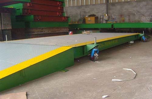 移動(dòng)式電子汽車衡的優點就是不用做基礎而且對地麵要求不高,主要是可以迅速移動到指定的位置並(bìng)在10分鍾內完成(chéng)安裝並進行稱量(liàng)。秤台采用剛柔相濟組合,盡可(kě)能的實現大稱量(liàng)的過載能力和對地(dì)麵要(yào)求的適應程度。引坡采用軍用浮橋技術與稱台緊密結合,在移動時可翻(fān)轉到秤的(de)台麵之上,以便於移動。